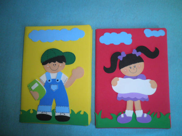 Comece separando todos os materiais que você vai utilizar em seu artesanato. Transfira as partes do molde para as respectivas cores de EVAs, com o auxílio do palito para churrasco, para não ficar marcas de lápis ou de caneta nos contornos das partes de EVA. Recorte as partes e monte o menino ou a menina, colando as partes menores primeiro e, depois, colando as partes maiores. Com as canetas coloridas, faça os detalhes da carinha e da roupa. Cole os enfeites. Encape o caderno com o EVA. Para finalizar a sua peça, cole o menino ou a menina de forma centralizada na capa do caderno. Se quiser, cole outros enfeites na capa. E está pronto!